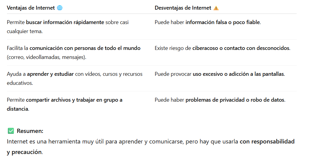 7. Elabora una tabla con ventajas y desventajas de Internet. (Escribe al menos dos de cada una).