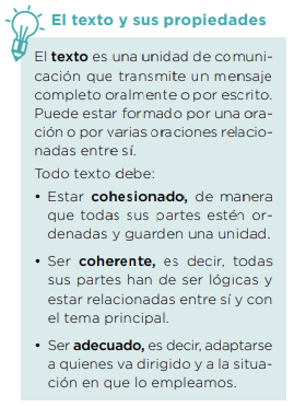 Un texto es un conjunto de frases que transmiten un mensaje. Para que sea claro, debe cumplir tres propiedades: coherencia, que significa que todas las ideas estén relacionadas; cohesión, que une las frases entre sí; y adecuación, que el texto se adapte a la situación y a quién lo lee.