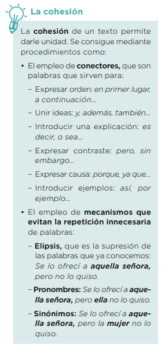 En la cohesión usamos conectores como además, pero o por eso para enlazar ideas. También evitamos repetir palabras con pronombres (él, ella), con sinónimos (niño / chico) o con elipsis, que consiste en omitir lo que ya se entiende.